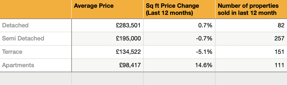 Over the last 12 months, the average price paid for a property in Morecambe stands at £166,483. It’s risen by approximately £2000 over the past 12 months. I’ve broken it down by property type below. Interestingly, the price paid per sqft remains steady at £191 per sqft.
