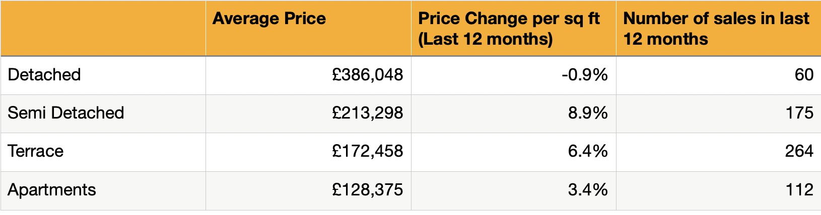 Looking deeper at the data, the standout performer over the last 12 months has been semi-detached homes, which have seen a significant price jump of 8.9% per square foot. With 175 sales in the past year and an average sale price of £213,298, this property type continues to be in strong demand—likely due to their family-friendly layouts and good value for money.
