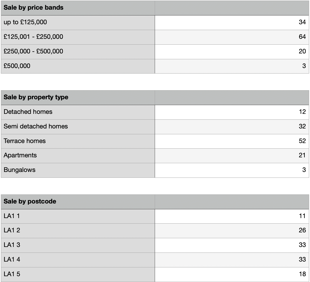 We also like to look at what sold where, the house type and also price ranges. 80.9% of all property sales are still under £250,000 in Lancaster. It is also encouraging to see that apartment sales have started to pick up after a slower start in the warmer summer months.