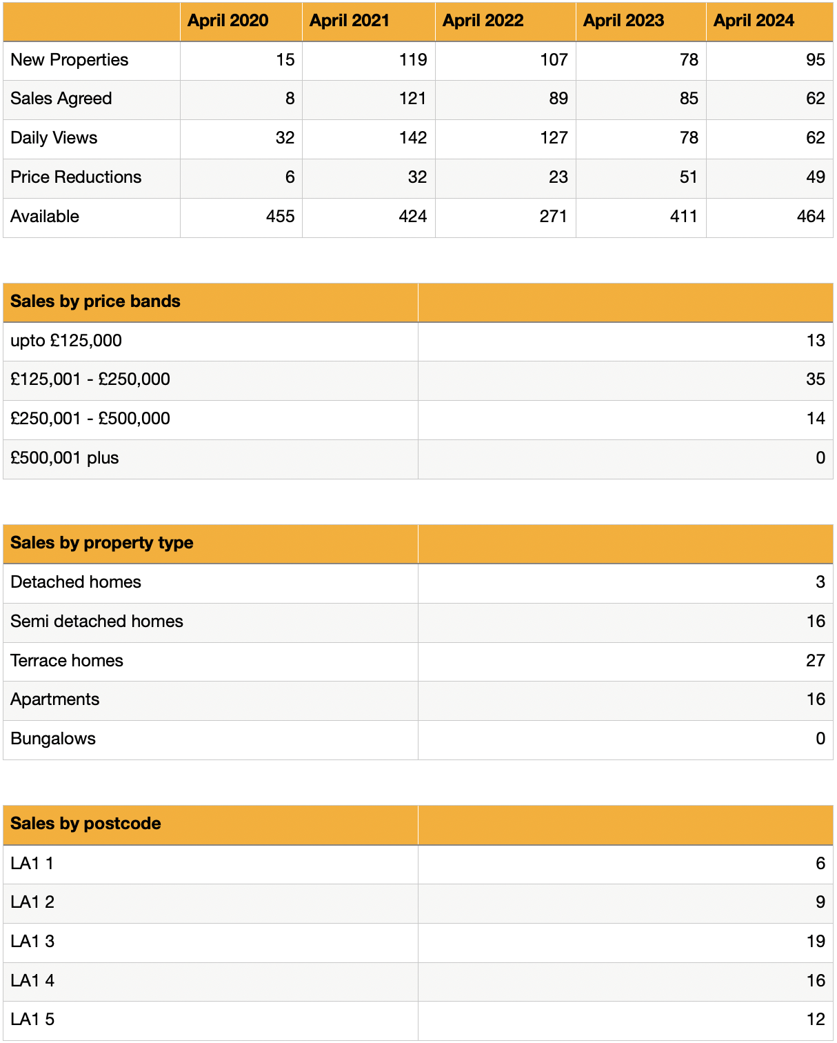 As we head into May there are 373 homes available for sale in Lancaster which is 5% higher than last month. On average, in LA1 it takes 70 days to find a buyer and a further 109 days to complete a sale.