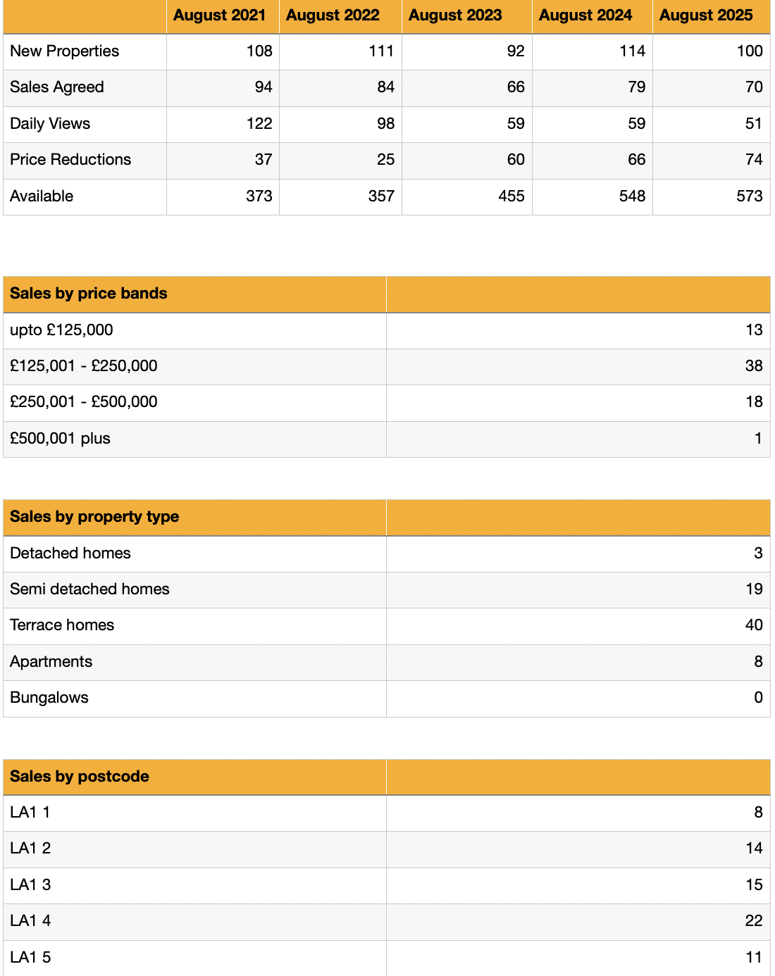 Looking at the postcodes, LA1 4 was the busiest area, with 22 homes going under offer – more than double some other parts of the city. Other active pockets included LA1 5 and LA1 3, though sales were more modest. This postcode breakdown is a useful reminder that Lancaster’s market is not uniform; activity can vary significantly street by street.