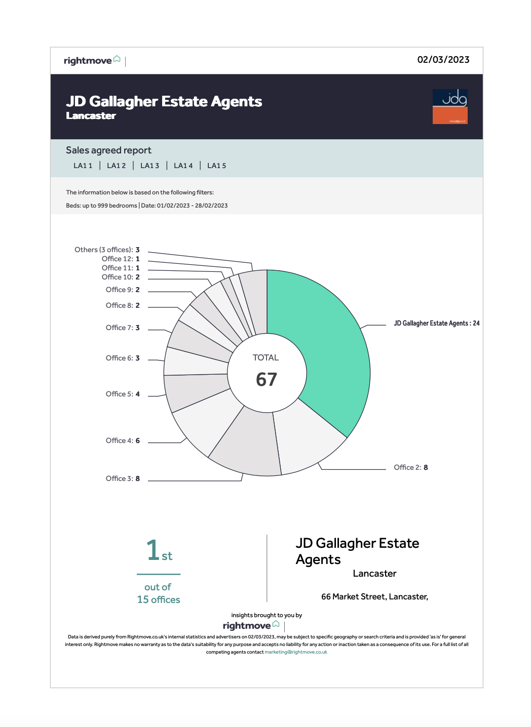 15 different estate agents we involved with the 67 property sales in February. At JDG, we had a superb month. 35.8% of all the property sales in Lancaster were with our company. We have the buyers registered and with our carefully crafted launch strategy, we are still achieving excellent results for our clients.