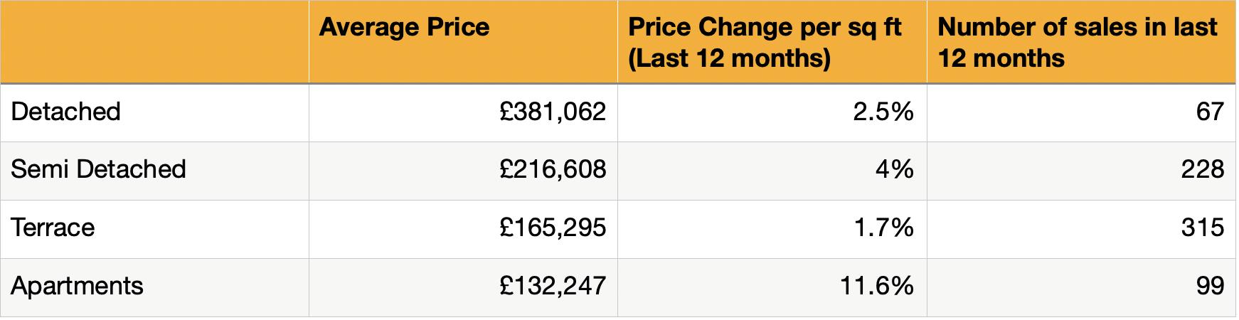 Price movement varies by property type. Semi-detached homes have shown steady growth, while terraced homes continue to provide stability. Apartments show the largest rise in price per square foot, which may catch attention, but this needs context. The increase is largely driven by the sale of a small number of larger, higher-spec apartments, lifting the average rather than indicating a broad rise across the apartment market.