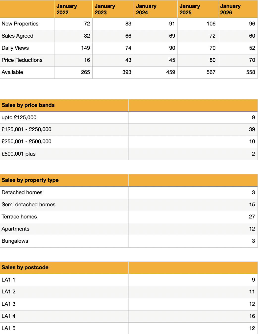 From a location perspective, LA1 4 was the most active postcode in January, followed closely by LA1 3 and LA1 5, showing that demand remains well spread across the city.