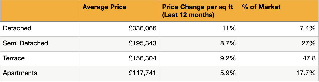 The average price of a home sold in Lancaster (LA1) now stands at £167,017. The overall average price is still higher than it was 12 months ago. The chart below shows you how different property types have performed over the past 12 months. We have used a square footage calculation to give a better and more accurate overview.