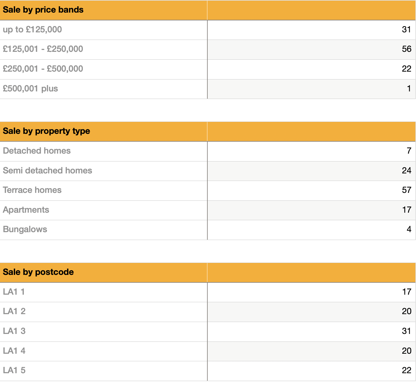Homes priced between £125,000- £250,000 also count for over 50% of all property sales. You can also see that LA1 3 was clearly the most popular area of the city. Looking even closer at the data 79% of the property sales in LA1 3 were terrace homes!