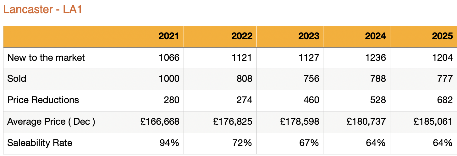 In Lancaster (LA1), 1,204 homes came to market during 2025, slightly down on the previous year but still healthy by longer-term standards. Sales remained consistent, with 777 homes sold, confirming that buyer demand is still very much present.