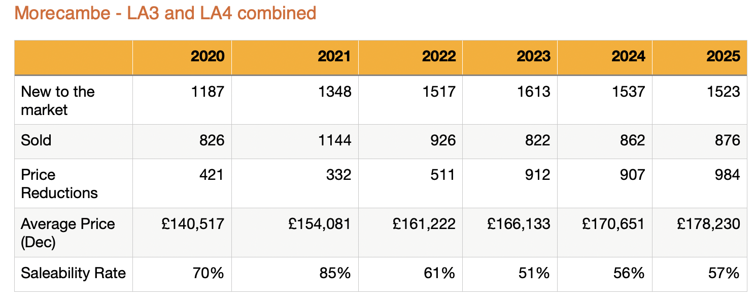 Across Morecambe (LA3 and LA4), 1,523 homes were listed during 2025, broadly in line with last year. Sales edged up slightly to 876 homes sold, which is encouraging and shows continued demand.