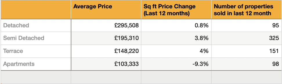 By price band, the strongest activity was in the £125,001–£250,000 bracket, where 52 homes sold — making up nearly two-thirds of all transactions. A further 14 homes sold under £125,000, while 14 sales were achieved in the £250,001–£500,000 range. No homes sold above £500,000 in September.