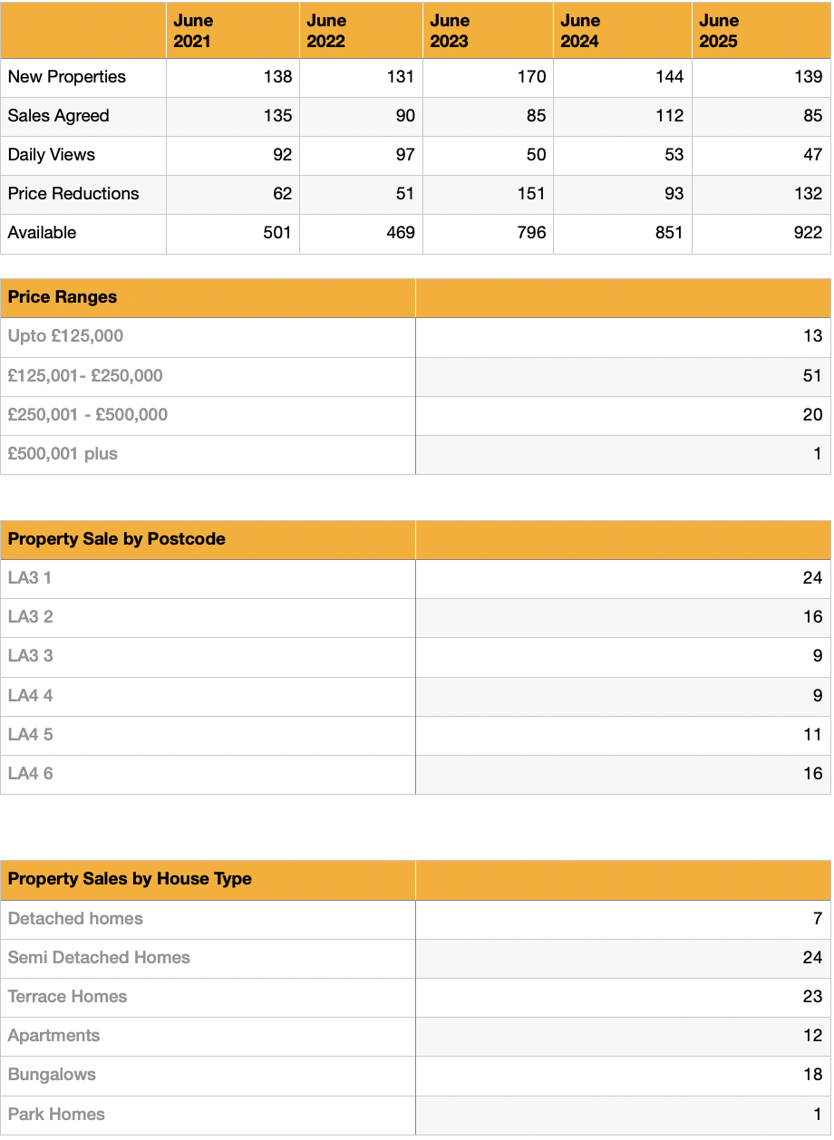 Summer is often considered one of the best times to sell in Morecambe. As a popular seaside resort, the warmer weather typically brings a seasonal boost to the housing market. However, this June, much like the changeable skies above the Bay, the property market has been mixed. According to the latest data, new property listings remain consistent with previous years—139 homes were brought to market in June 2025, not far off last year’s 144. Yet it’s the sales figures that tell the real story: just 85 sales were agreed, matching the June 2023 low and well below the 112 recorded in 2024. This suggests that while sellers are active, buyers are hesitating, and the market is starting to feel the pressure.