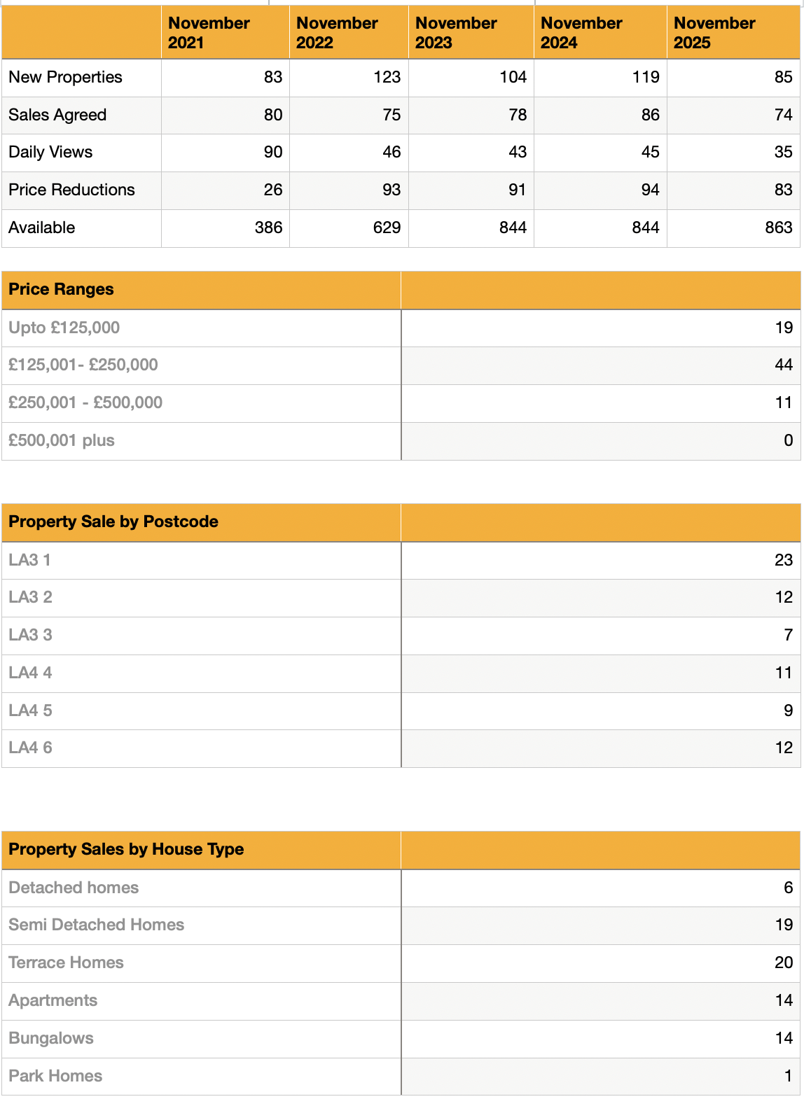 November saw 74 agreed sales in Morecambe—slightly down on last year’s 86, reflecting the quieter lead-up to the Budget.