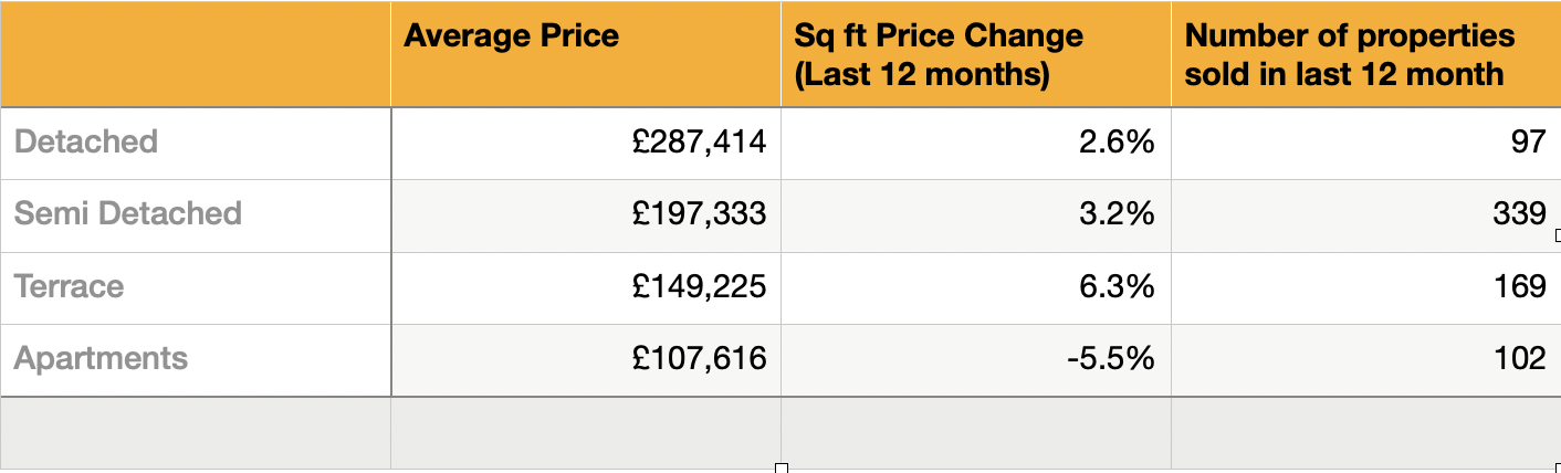 Detached homes continue to show steady growth at 2.6% year-on-year and an average price of £287,414, while apartments remain the only segment facing downward pressure, with prices down 5.5% year-on-year. Even so, activity levels are still healthy, with 102 apartment sales completed over the year.