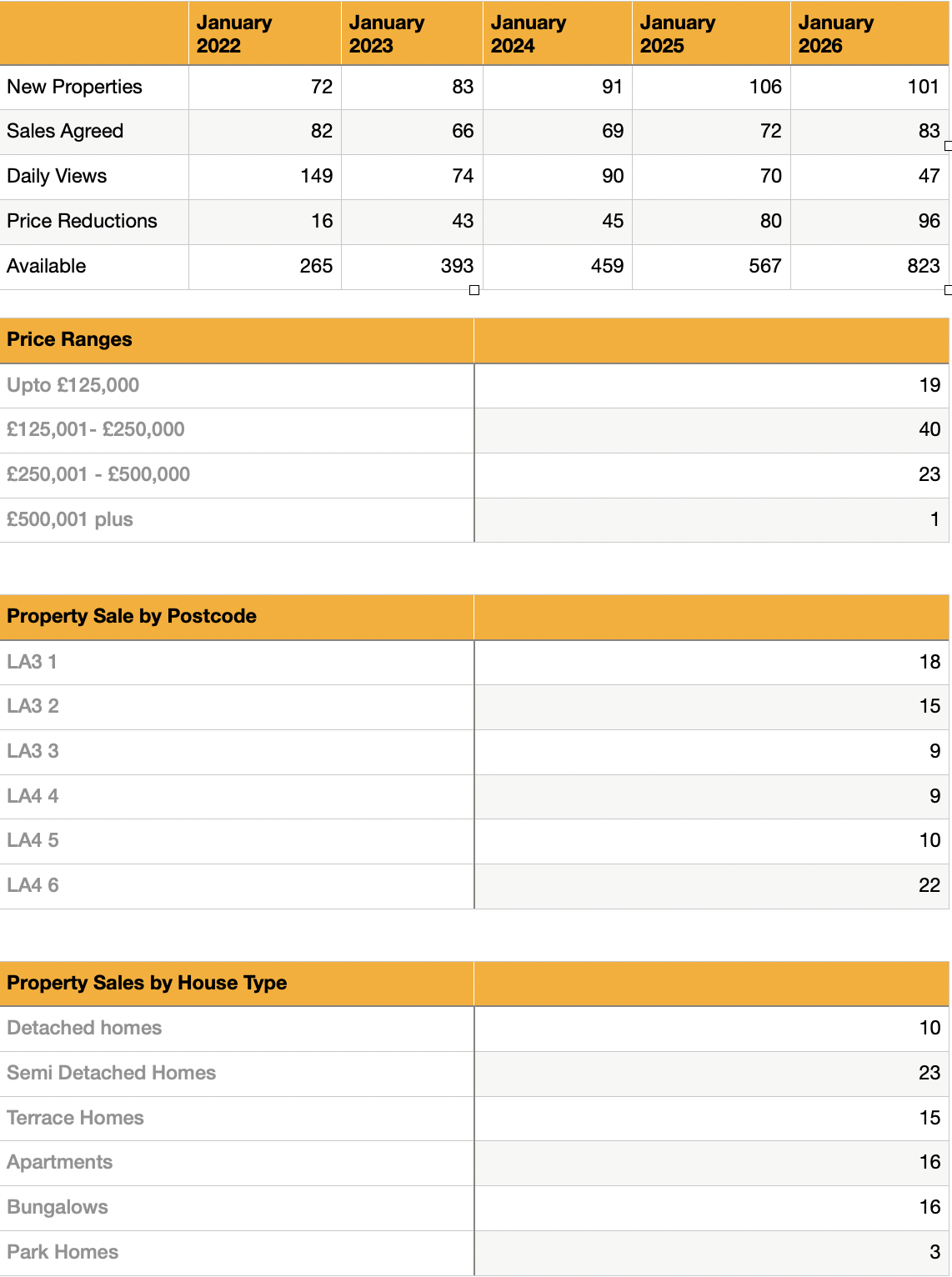 Sales activity in January was strongest in the £125,000 to £250,000 price range, which continues to form the core of the Morecambe market. This range appeals to a broad mix of buyers, including first-time buyers, downsizers, and investors, all of whom remain active despite wider economic pressures.