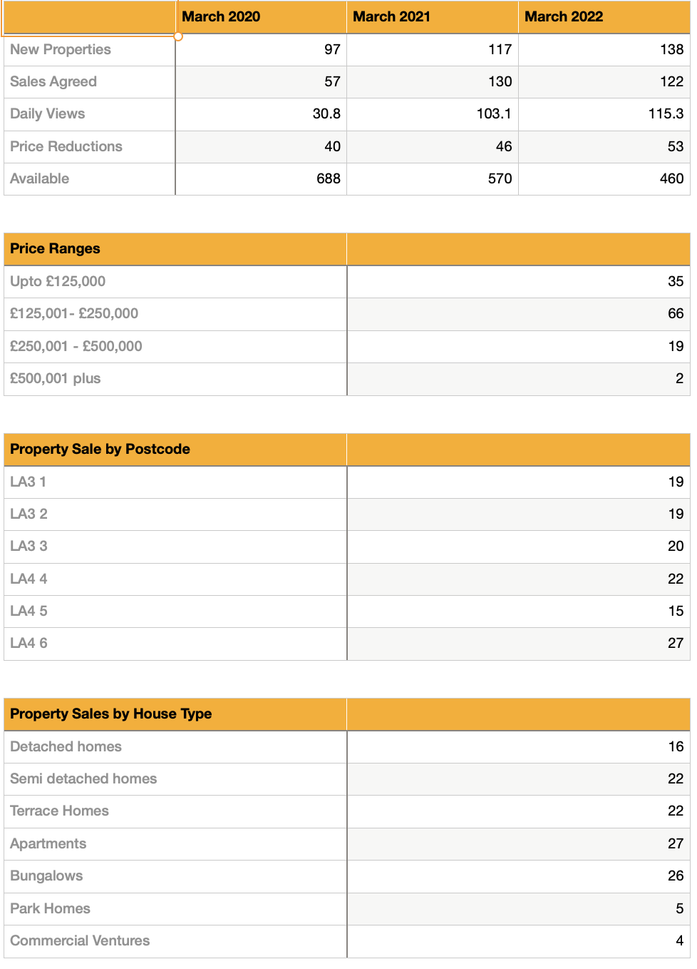 As we head into April there are just 304 homes for sale in Morecambe. That is slightly up on last month when there was just 292. I like to check struggling properties and this month there are 138 homes for sale in Morecambe that have been for sale for 12 weeks or longer. 69 of these are with one estate agent. If your home is one of these, can we talk? We would love to be able to help.